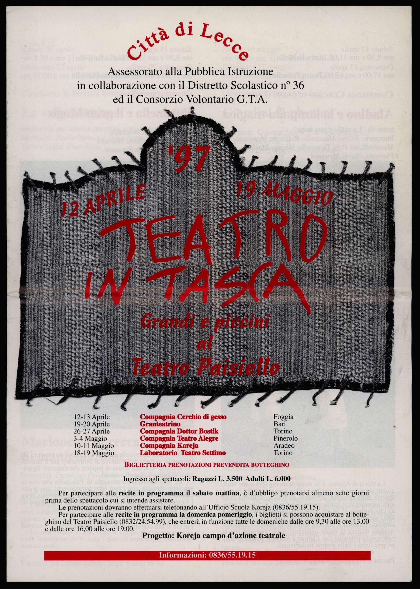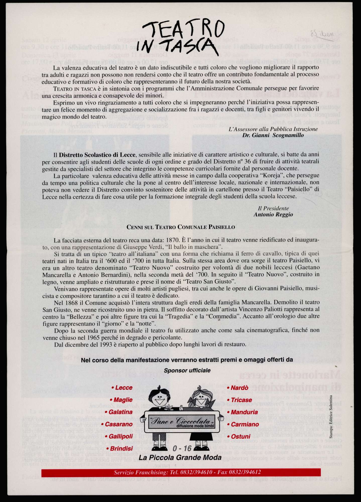 DESCRIZIONE Creatore: Città di LEcce – Assessorato alla Pubblica Istruzione in collaborazione con il Distretto Scolastico n. 36 ed il Consorzio Volontario GTA Luogo dell'evento: Teatro Paisiello – Lecce