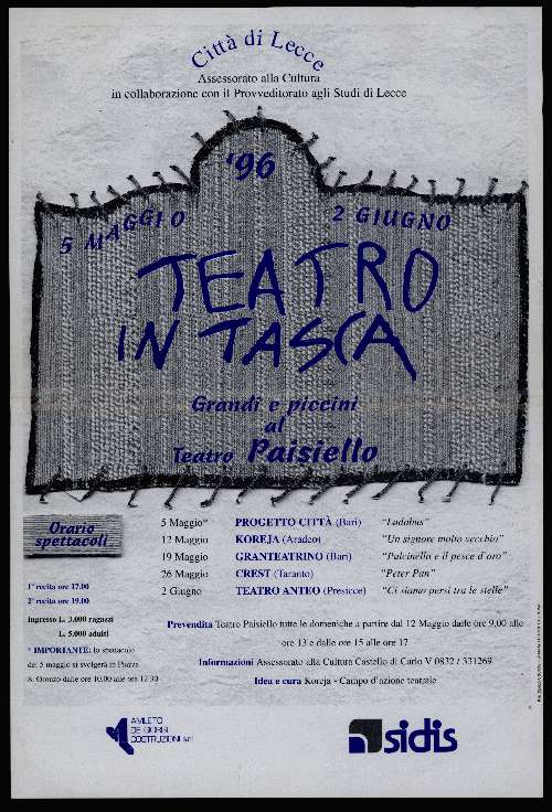 Koreja non è solo produzione artistica, ma anche comunità ed educazione. I fascicoli delle attività raccontano i laboratori scolastici e i progetti Teatro Scuola e La scena dei ragazzi. I manifesti delle rassegne Teatro in tasca e Open Dance parlano di un teatro pensato per i bambini e i giovani. Le fotografie ritraggono studenti alle prese con il palcoscenico, mentre i VHS conservano i saggi finali. Tra i materiali compaiono dispense, copioni annotati, pieghevoli didattici. L’archivio diventa così la prova concreta di un impegno civile, capace di trasformare il teatro in esperienza di crescita condivisa.